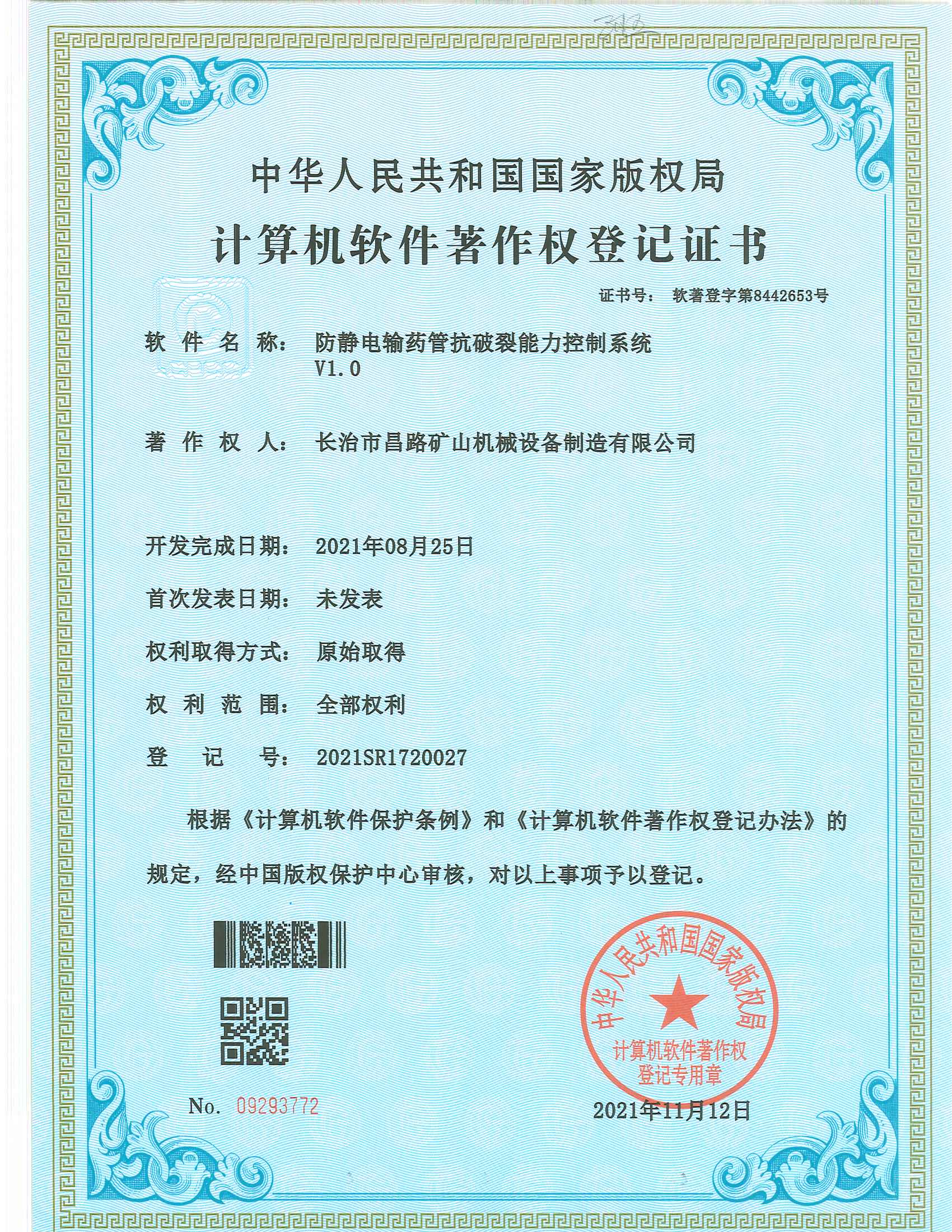 防靜電輸藥管搞破裂能力控制系統(tǒng)著作權登記證書